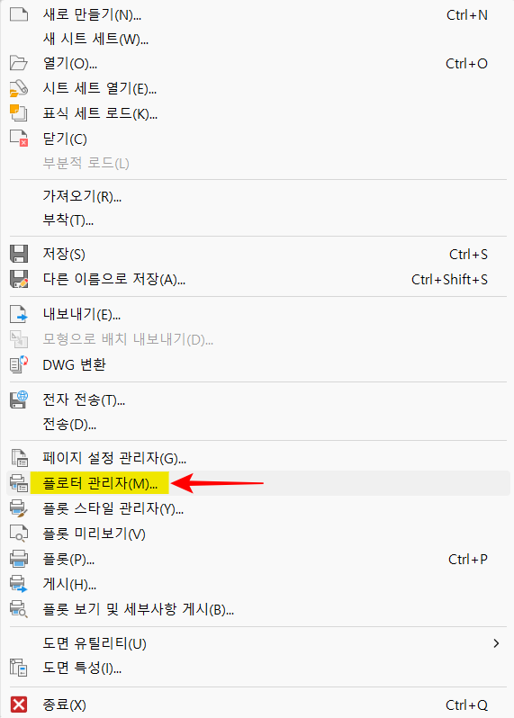 설정 방법은 명령창에서 "PLOTTERMANAGER" 입력하거나 파일 메뉴에서 '플로터 관리자'를 클릭하시면 플로터 장치 폴더가 열립니다.