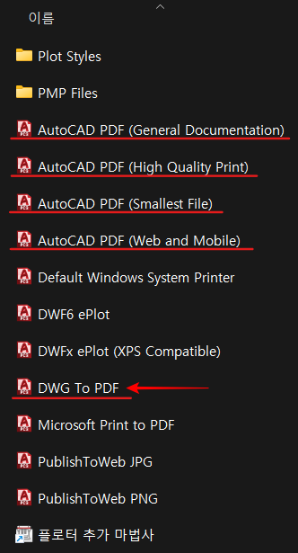 참고로 'AutoCAD PDF (General Documentation).pc3', 'AutoCAD PDF (High Quality Print).pc3',